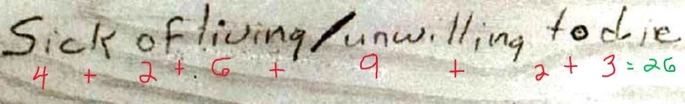 That is at least three instances of a Z-26 Theme in the Desktop Poem: r + h = Z (or the rh-initials), the Twenty-Six Letter Title (Sick of living/unwilling to die), and I/Eye am Z. And as the Desktop Poem was found almost three years before the debut of the Zodiac (Killer) moniker, its Z-26 Theme could not be some subtle misdirection about the poet’s identity; it is either nothing or everything when it comes to answering the question of whether the Zodiac Killer was the poet.