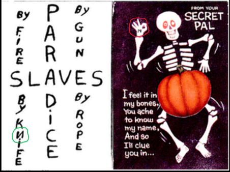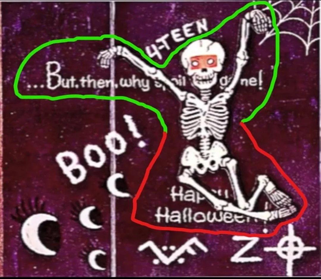 More evidence that Eye Images = Letter I’s comes in the form of the Skeleton’s O.K. Sign (as circled in the second image up), which occurs on the same hand as the HANDwritten 14 that refers to the Halloween Card’s fourteen added eye images; the o.k. sign is three fingers up, and there are three handwritten letter I’s on the left-frontside of the card (they stick out like a sore thumb because they’re lowercase). In other words, the One-Eyed Skeleton’s right hand refers to the Fourteen Added Eye Images and the Three HANDwritten I’s. The result is Right Hand = Added Eyes and Added I’s.