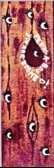The back of the Halloween Card has a total of thirteen eye images: the 9 Eyes on Wood (which seem to represent I-9 in the alphabet-number code) plus the 4 Eyes Under Boo! (is somebody sad about having to wear eyeglasses?).