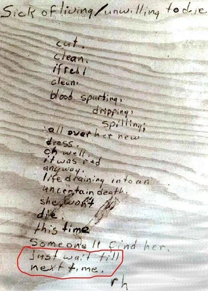 Moreover—just by virtue of its holiday theme, the Halloween Card may be intended as a reference to how the murdered body of Cheri Jo Bates was found on Halloween morning in 1966. Eerily, that horrific event seems to have been foreshadowed by the Desktop Poem’s final statement “just wait till next time” (as circled in third image up).