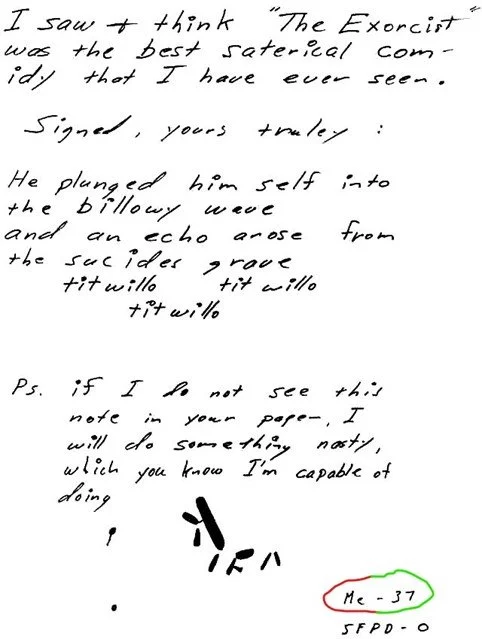 “Me - 37” appears near the bottom of “The Exorcist” Letter, which is widely considered to have been written by the Zodiac Killer. And perhaps by design, Me - 37 looks exactly like a code; between the alphabet-number code and the Halloween Card’s Theme of 37, Me - 37 could be a representation of the Zodiac Killer’s actual name. Fittingly, The Exorcist Letter uses neither the Zodiac moniker nor the cross-and-circle insignia for Zodiac brand watches—and it is the first time they were both left out since they (separately) debuted in the killer’s correspondences. In other words, the Zodiac moniker may have been traded in for a symbolic version of the killer’s real name.