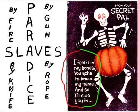 Along with the Strikethrough Skeleton = Sullivan solution (the Strikethrough Skeleton and the described similarities between “skeleton” and “Sullivan”), that makes three clues to the Zodiac Killer’s identity thereon the Halloween Card. The other two clues have thematic support in other Zodiac Killer-related documents (because the Theme of/Me - 37 = RS solution is partly based on Me - 37 from The Exorcist Letter, while the 9 Eyes on Wood = the 9th Letter of Ross Sullivan solution includes Eye Imagery Added to Wood like the O/Eye Image from the Desktop Poem).