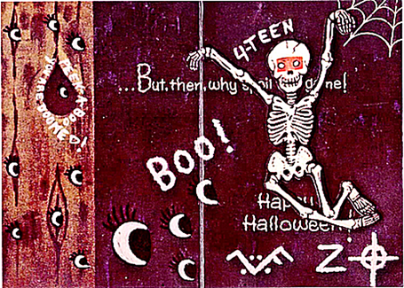In addition to what its 37 Handwritten Characters say, the front of the Halloween Card has original printed text that says, “I feel it in my bones, You ache to know my name, And so I’ll clue you in. . .” However, the original text on the back of the card (apparently) says, “. . . But, then, why spoil the game! Happy Halloween!” Yet there is a skeleton added to the back of the card, and it blocks out a good portion of that mocking text. Cutting to the chase, the skeleton on the back of the card acts like a strikethrough (a line like this) that negates the original text.