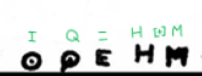 The second row’s eye image couples with the letter I to its left and symbolizes two eyes watching me—as I solve the sequence going in the opposite direction: I Q Equals H (plus) M. . . . The sequence ultimately says IQ = You (which in this case is me). Can you tell why?