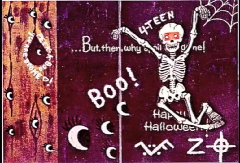 Appearing on the same side of the Halloween Card as the Strikethrough Skeleton, the Nine Eyes on Wood are another visual pun; as also described in Blog Post #3, they represent how I is simultaneously the ninth letter of the alphabet and the ninth letter in Ross Sullivan—because eye the sensory organ is a homophone for I the letter.