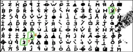 Backwards K = I occurs exactly nine times throughout the z408 cipher; each representing the letter I, the nine Backwards Ks work as yet another reference to how I is the ninth letter of the alphabet—in other words, I-9 of the alphabet-number code.