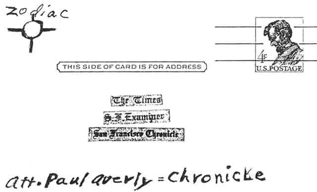 The back of the Sierra Club Card self-indicates that it was mailed out by the Zodiac Killer. It also features the bizarre equation “Paul averly = ChronicLe.” In other words, it shows that names and/or letters have values.