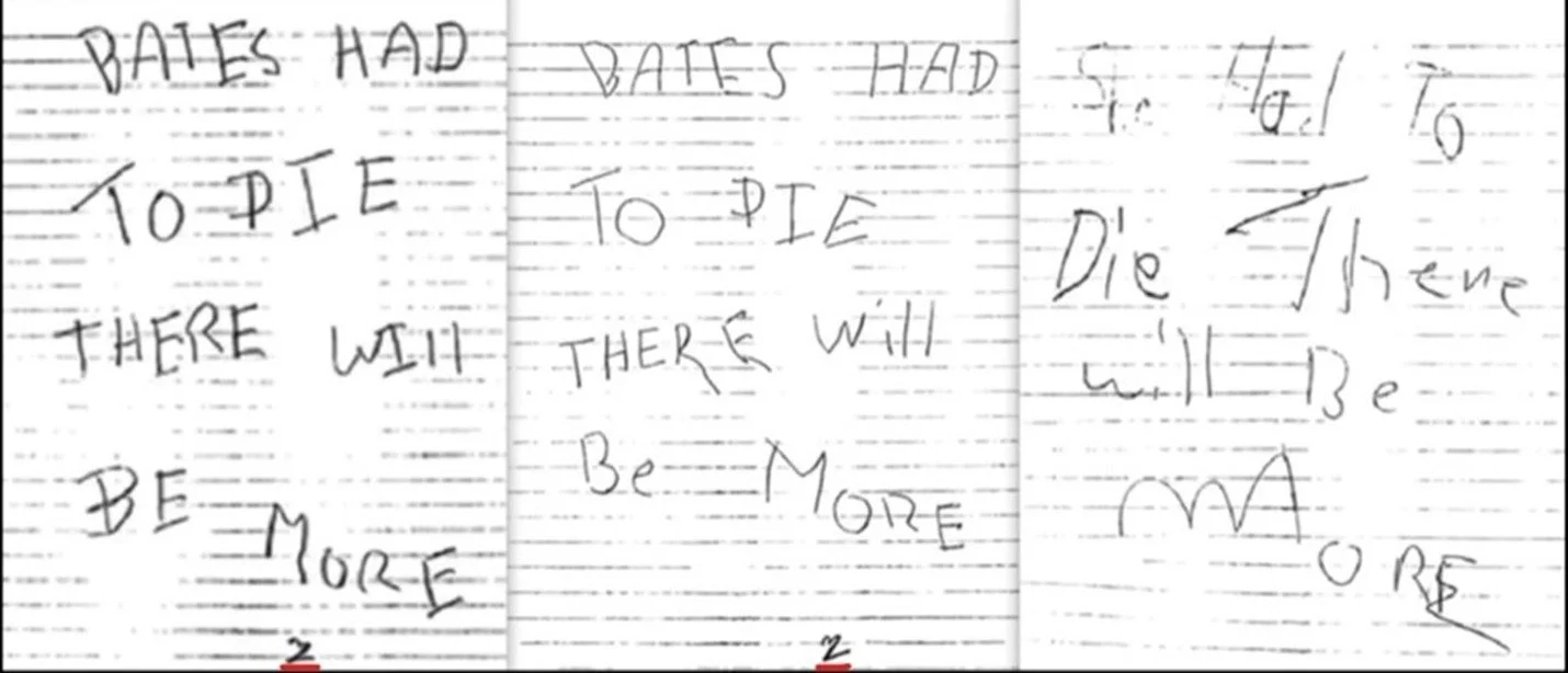 Above is an image of the Bates Letters (aka the Riverside Letters), which are a set of three letters concerning the murder of Cheri Jo Bates. Each sent to a different address, all three Bates Letters were postmarked 4/30/1967. The date fits with the Theme of 26 because 30 - 4 (the day minus the month) = 26—and of course, the twenty-sixth letter of the alphabet is Z as in Zodiac. Appropriately, a strange Z-like thing appears at the bottom of two Bates Letters (as underlined in the image above).
