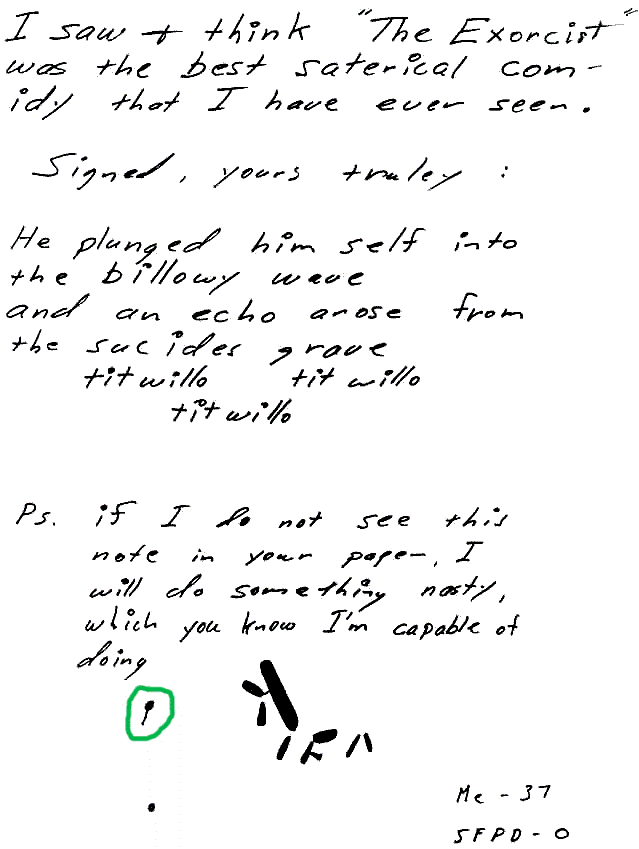 The first image above is of “The Exorcist” Letter; the second image above is of the envelope THE CONFESSION letter was received in. If they were written by the same hand, it would mean—with virtual certainty—that Cheri Jo Bates was murdered by the Zodiac Killer. Below is a list of their commonalities.