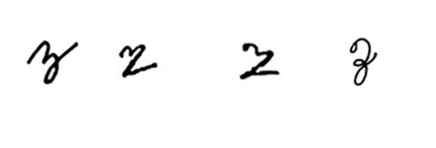 To make a long story short, the Bates Letters’ Z-like thing is a cursive Z and a print Z blended together (a visual portmanteau); the two-in-one design seems to be a metaphor for how R and H (from the Desktop Poem’s rh-initials) combine to represent Z, the twenty-sixth letter of the alphabet (again, because R is the eighteenth letter of the alphabet, while H is the eighth—and 18 + 8 = 26). Accordingly, it is called the Cursive-Print Z throughout Essay: The Zodiac Killer's Alphabet-Number Code. The image below is the Cursive-Print Z’s only two known appearances sandwiched by cursive Zs.